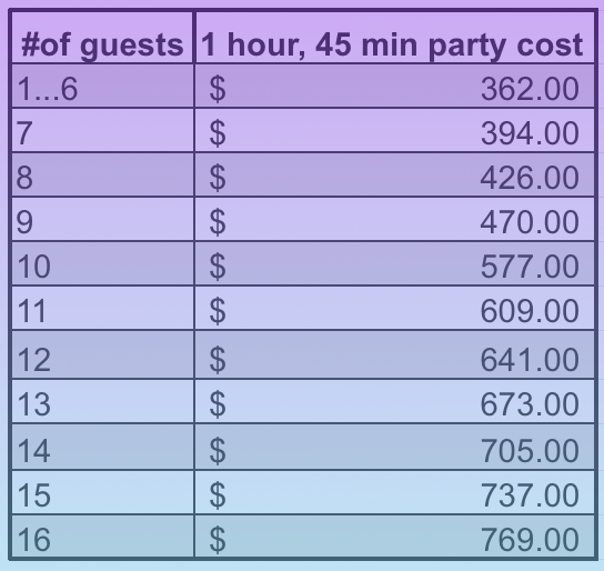 There is an option to rent the studio space at a rate of $50/hour after your instruction time concludes. Please remember that any additional services or entertainment should be cleared with party management before booking!