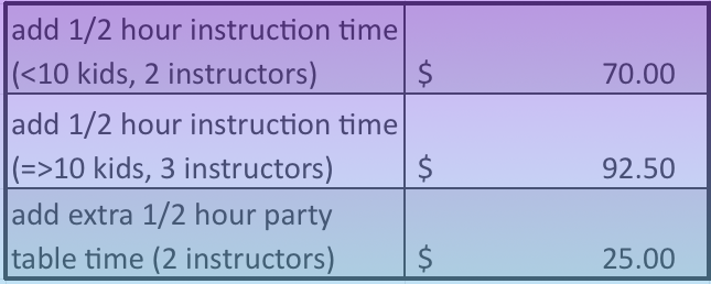 1 hour, 15 minutes instruction with 2 Instructors (3 instructors, if your party has 10+ young guests) followed by